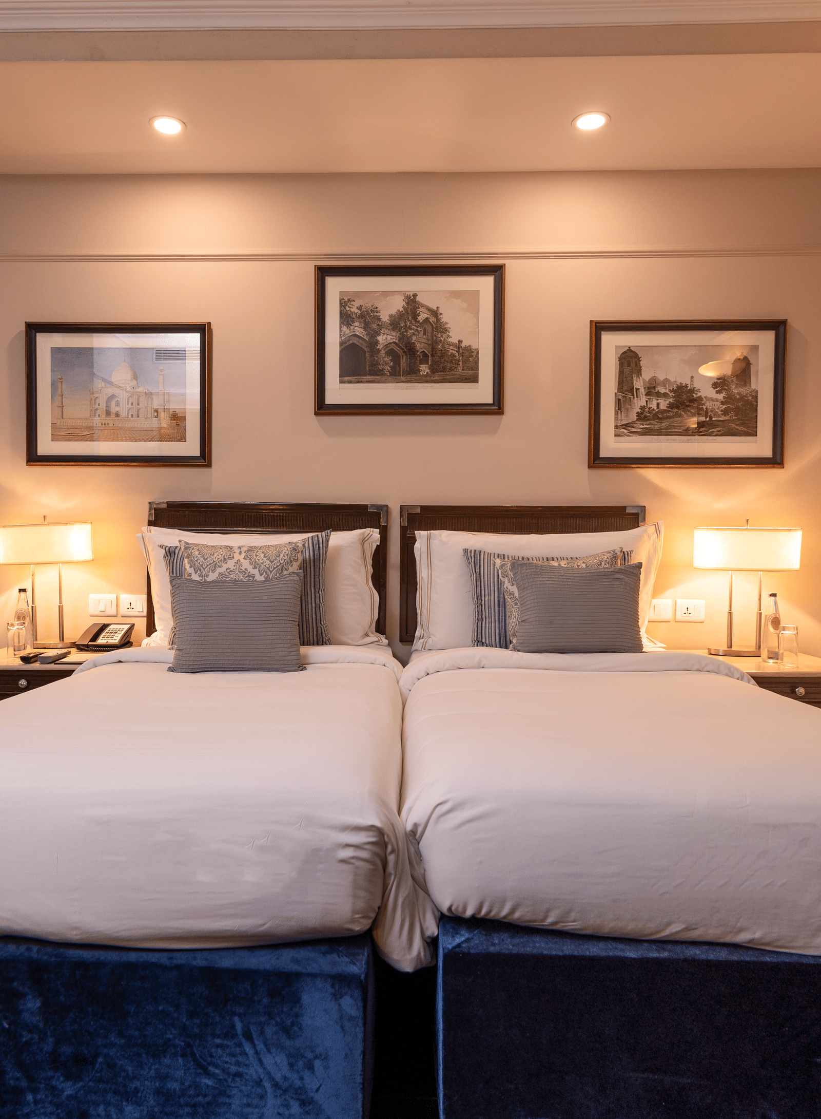 This room, designed for two, combines classic British charm with modern luxury. With elegant ivory walls, grand archways, and a mix of leather and wood, it exudes timeless sophistication. Enjoy plush twin beds and admire antique English artwork for a regal stay in New Delhi.